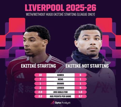 据统计,本赛季到目前为止,利物浦在埃基蒂克首发的10场比赛中取得了7胜1平2负的成绩,场均进球2.0,场均积分为2.2。