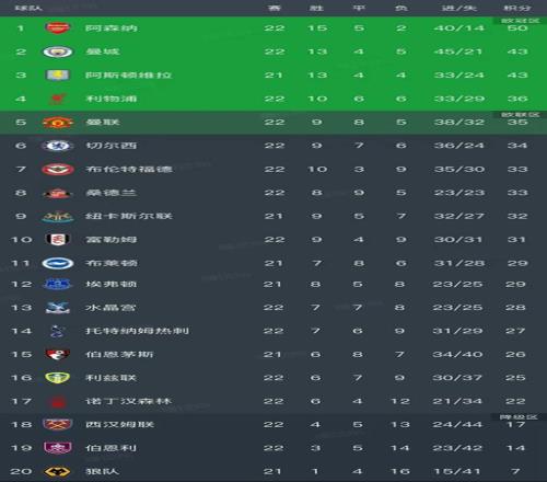 领头羊阿森纳榜首的位置还是比较稳固的,本轮在客场0-0闷平了诺丁汉森林,这一场比赛枪手拥有60%的控球率,15-6的射门次数,但没有转化出进球,马丁内利、赖斯、哲凯赖什、萨卡等人的射门都被拒绝。只拿到一分的枪手积分上涨到50分,领先了第二名的曼城和阿斯顿维拉7分,曼城本轮输给了曼联,阿斯顿维拉的比赛还没有进行,将在主场和埃弗顿一较高下!