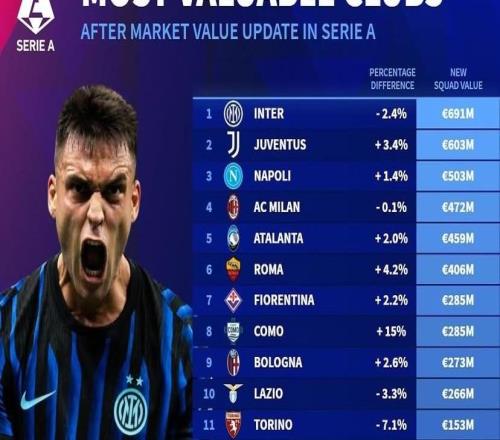 北京时间10月7日,在更新了意甲球员的身价之后,德转还列出了此次更新后意甲俱乐部总身价的涨幅情况以及具体排名,国际米兰以6.91亿欧元排名第一,随后分别是尤文图斯、那不勒斯以